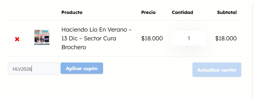 Luego de elegir el evento, al confirmar tu compras, accederás al carrito de compras donde podrás ingresar tu código de descuento: